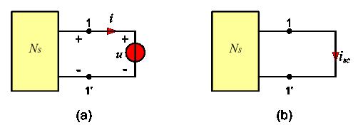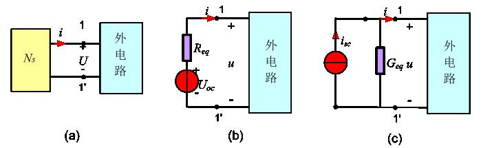 一个含独立电源,线性电路和受控源的一端口,对外电路来说,可以用一个电流源和电导的并联组合来等效变换(如图4.3.3所示),此电流源的电流等于该一端口的短路电流,而电导等于把该一端口的全部独立电源置零后的输入电导。