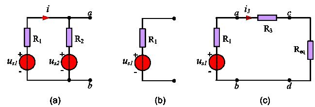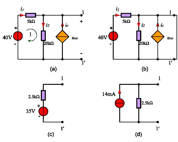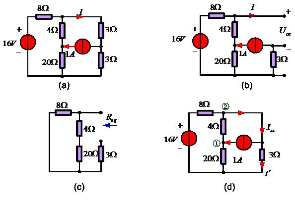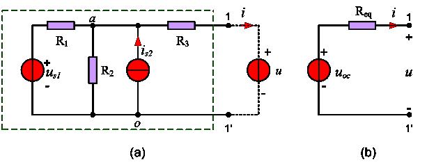 2)当一端口内部含受控源时,将它的全部独立电源置零后,它的输入电阻可能等于零。这时,戴维南等效电阻为零,等效电路成为一个电压源。在这种情况下,对应的诺顿等效电路就不存在,因Geq=∞。同理,如果输入电导等于零,诺顿等效电路成为一个电流源。这种情况下,对应的戴维南等效电路就不存在,因Req=∞。通常情况下,两种等效电路同时存在。