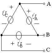 把对称三相电源顺序连接成一个回路,再从端点A、B、C依次引出端线,如图12.2.3所示,就成为三相电源的三角形连接,简称△形连接。三角形连接的相电压、线电压、相电流、线电流的概念与星形相同。可见,三相电源三角形连接时线电压等于相电压,但线电流不等于它的相电流。 应该指出,三相电源作三角形连接时,要注意接线的正确性。当三相电压源连接正确时,闭合回路中总的电压为零,即