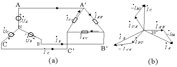 而线电流相位滞后后继相相电流30o,其对应相量图如图12.3.2(b)所示。但负载三角形连接时,无论三相是否对称,总有线电流