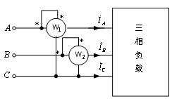 对于三相三线制电路,不管负载对称还是不对称,也不管负载是星形还是三角形联接,都可以用两个单相功率表测量三相负载的功率,如图12-13所示,这种测量方法称为二瓦计法。