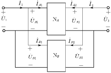 即两个二端口网络并联的等效Y参数矩阵等于各二端口网络的矩阵YA和YB之和。同理,当n个 二端口网络并联时,则复合后的二端口网络Y参数矩阵为: