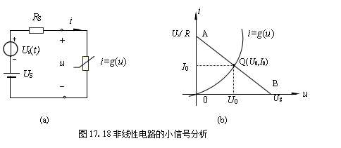 小信号分析法是分析非线性电阻电路的一种极其独特的方法。在工程实践中,特别是在电子电路中,常会遇到既含有作为偏置电路的直流电源又含有交变电源的非线性电路。而且交变电源相对直流电源要小得多。如图17.18(a)所示电路。US为直流电压源,