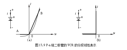 非线性电阻的特性曲线,用分段线性化来描述。例如图17.9所示p-n结二极管的特性曲线,该曲线可以粗略地用两段直线来描述,如图中粗线A0B。这样,当这个二极管施加正向电压时,它相当于一个线性电阻,