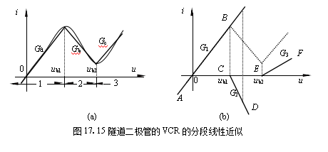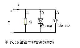 解为如图(b)中直线AOB,折线OCD和折线OEF,这3条曲线分别代表了电导为G1的线性电阻、折点为ub1而斜率为G2的凹电阻和折点为ub2而斜率为G3的凹电阻的特性曲线,所以图17.15(a)的隧道二极管的特性曲线是其等效电路如17.16图三个元件的并联的特性曲线。