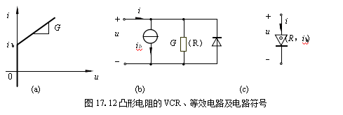 ,凸电阻元件的等效电路如图17.12(b)所示,它可用一个电流等于ib的电流源与电导等于G的电阻和理想二极管并联组合来表示。凸电阻元件的电路符号如图17.11(c)所示。
