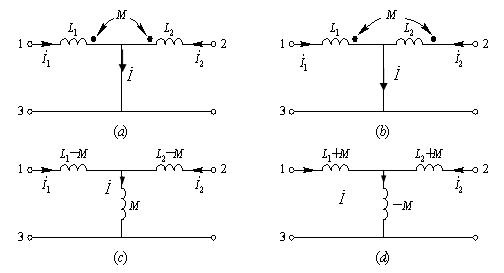 根据式(10.9)的伏安关系及等效的概念,图10.16(a)所示的具有互感的电路就可以用图10.16(c)所示无互感的电路来等效。