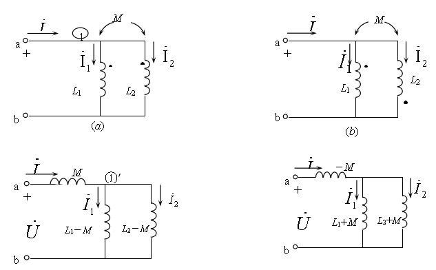 如果耦合电感的2条支路各有一端与第三条支路形成一个仅含三条支路的共同结点,称为耦合电感的T形联接。显然耦合电感的并联也属于T形联接。T形连接有两种方式,同名端为共同端的T形连接和异名端为共同端的T形连接。