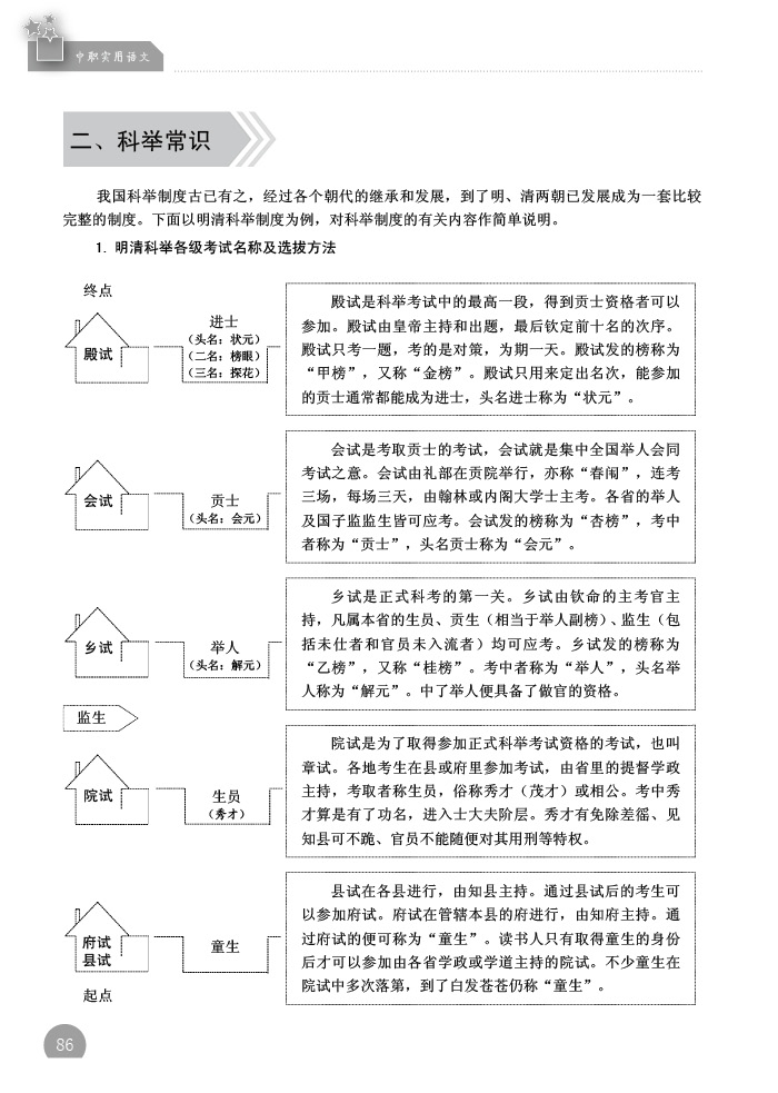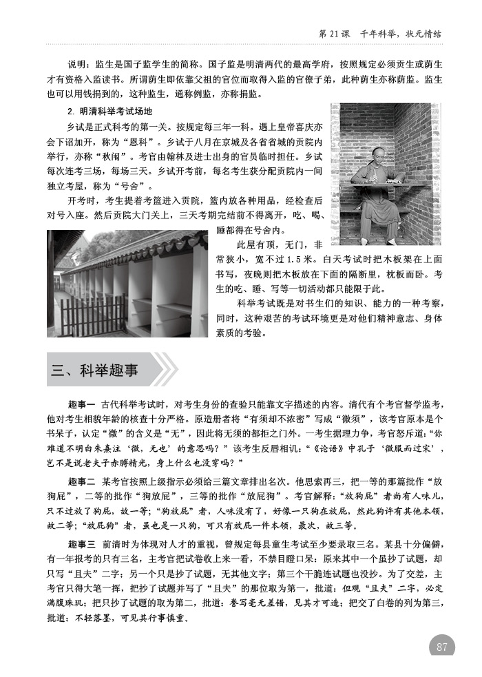 1.了解科举制度的相关知识,认识科举制度各级考试的名称及选拔方法,加强知识积累;