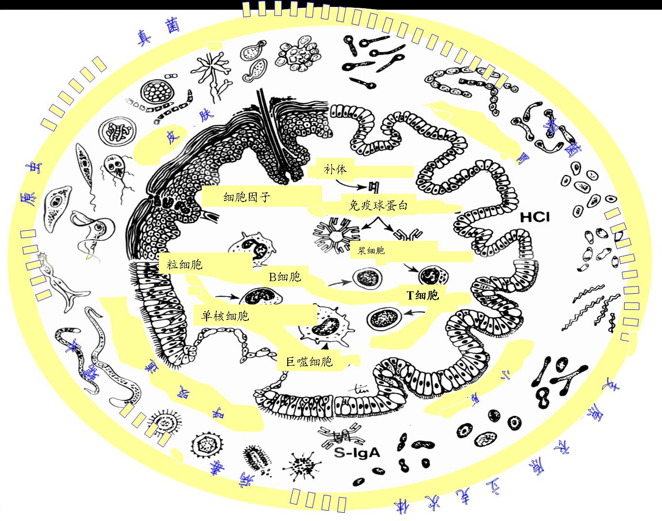 皮肤粘膜的机械阻挡作用和附属物(如纤毛)的清除作用;皮肤粘膜分泌物(如汗腺分泌的乳酸、胃粘膜分泌的胃酸等)的杀菌作用;体表和与外界相通的腔道中寄居的正常微生物丛对入侵微生物的拮抗作用等,属于机体第一道防线,其次是内部屏障。抗原物质一旦突破第一道防线进入机体后,即遭到机体内部屏障的清除,包括:淋巴和单核吞噬细胞系统屏障;正常体液中的一些非特异性杀菌物质;血脑屏障和胎盘屏障等。