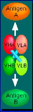 双特异性抗体是指能同时识别2种抗原的抗体(图4-16),一种为对应肿瘤相关抗原。另一种为对应效应成分,即能结合靶肿瘤细胞又能结合高细胞毒性的效应细胞,将效应细胞富集在肿瘤周围,实现对肿瘤细胞的杀伤和裂解。特点:除了能特异性识别肿瘤细胞外,还能将循环血液中的免疫效应细胞再导向至肿瘤细胞处,从而使效应细胞的抗肿瘤活性增强,发挥免疫导向作用。