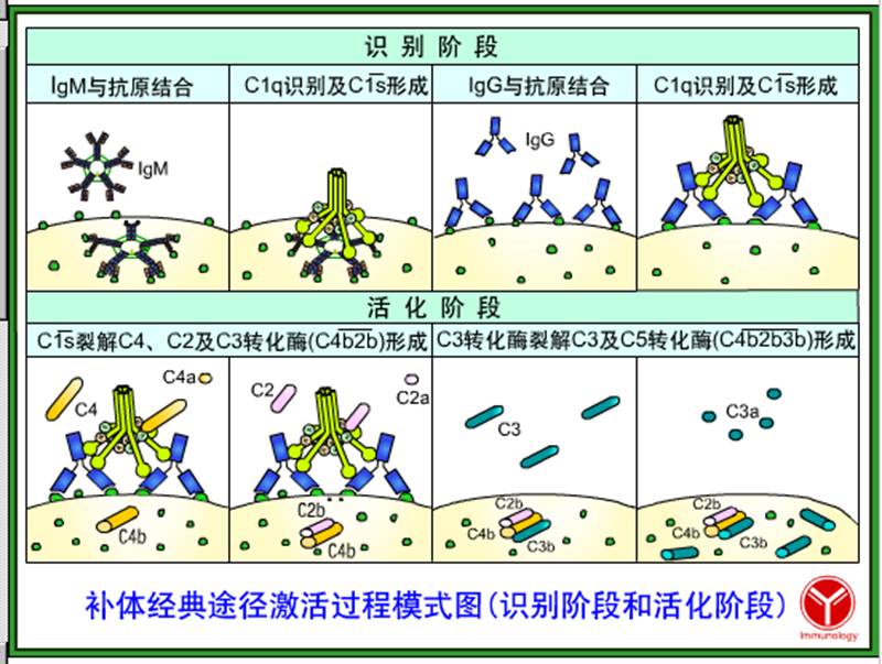 1、识别阶段:当抗体与抗原结合后,抗体构象发生改变,暴露出位于Fc段上的补体结合点,Clq便与之结合。继而激活Clr、C1s。