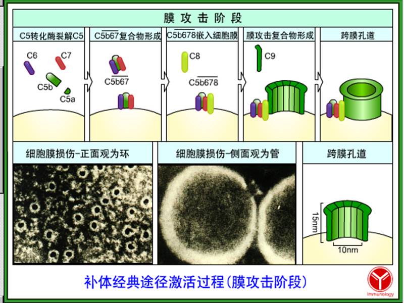 最终形成膜攻击复合物,造成靶细胞膜的损伤和靶细胞溶解。C5转化酶裂解C5形成的C5b可依次结合C6、C7,形成C5b67复合物并结合在细胞表面。C8可结合该复合物中的C7,进而通过构型改变插入细胞膜脂质双层,使形成的C5b678复合物牢固地附着在细胞表面,并使细胞膜出现轻微损伤,但其溶细胞能力有限。当附着在细胞膜表面的C5b678复合物与C9分子结合,聚合12~15个单链的C9分子形成C5b~9复合物,才可在细胞膜上形成孔道。因此C5b~9称为膜攻击复合物(MAC)。电镜下可见到这种聚合C9分子是一个中空的多聚体,插入靶细胞的脂质双层膜后可造成细胞膜上内径为11nm的小孔,导致细胞内容物外漏,最终导致靶细胞溶解破坏。