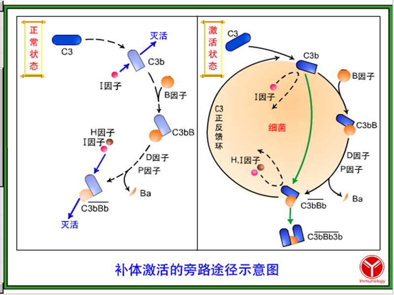 2、激活过程:不需要C1、C4、C2参与,血浆中天然的C3能缓慢分裂成C3b是关键。
