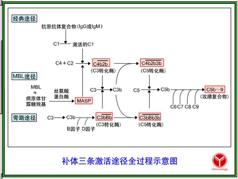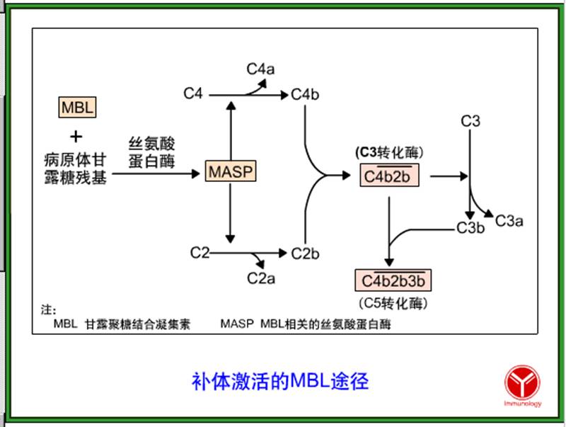 ③通过甘露聚糖结合凝集素(mannan binding lectin, MBL)糖基识别的凝集素激活途径(MBL pathway)。此外,上述三条途径有共同的终末反应过程。