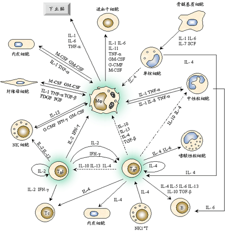 一般情况下,免疫细胞是细胞因子的主要来源,尤其是激活的淋巴细胞和单核/巨噬细胞可产生多种细胞因子。据此,可根据细胞因子的来源将其分为淋巴因子(lymphokine)和单核因子(monokine)。前者包括IL-2、IL-4、IL-5、IFN等;后者包括TNF-a、IL-1、IL-6、IL-8等。