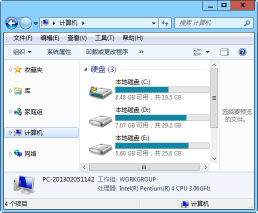 双击桌面上“计算机”图标或右键单击【开始】→【打开Windows资源管理器】(对应快捷键【Windows+E】,就可打开“资源管理器”窗口,如图所示:
