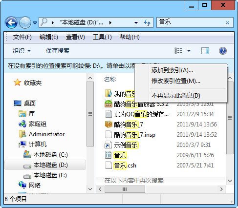 在搜索文件夹时,资源管理器的动态工具栏下方会显示一条将文件夹添加到索引位置的信息,在信息条上单击鼠标,并在打开的菜单中选择“添加到索引”选项,便可快速将文件夹添加到索引位置中,如图: