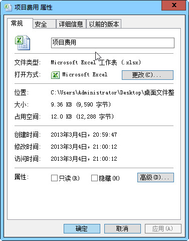 用鼠标右键单击文件,在弹出的快捷菜单中选择“属性”命令,弹出如图所示的“×××属性”对话框。在“常规”选项卡的属性栏中记录了文件的图标、名称、位置、大小等不能任意更改的信息。另外,还提供了可以更改的文件的“打开方式”和属性。其中“只读”属性表明只能对该文件进行读的操作,不允许更改和删除。若将文件设置为“隐藏”属性,则该文件在常规显示中将不被看到,可避免文件因意外操作被删除或损坏。