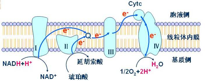 琥珀酸→FADH2→FeS→CoQ→Cyt b→Cyt c1→Cyt c→Cyt aa3→O2