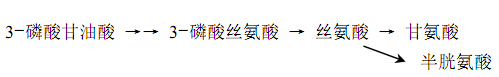 丝氨酸族氨基酸包括丝氨酸、甘氨酸和半胱氨酸。丝氨酸是由糖酵解中间产物 3-磷酸甘油酸合成的。3-磷酸甘油酸首先被氧化成 3-磷酸羟基丙酮酸,然后经转氨作用生成 3-磷酸丝氨酸,水解后产生丝氨酸。丝氨酸族氨基酸合成关系如下: