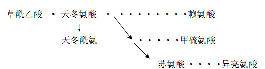 这一族包括天冬氨酸、天冬酰胺、甲硫氨酸、苏氨酸、赖氨酸和异亮氨酸。它们的共同碳架是三羧酸循环中的草酰乙酸,草酰乙酸经转氨反应就可生成天冬氨酸,然后天冬氨酸再经天冬酰胺合成酶催化即可生成天冬酰胺。天冬氨酸族氨基酸合成关系如下: