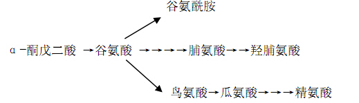 这一族包括谷氨酸、谷氨酰胺、脯氨酸和精氨酸。它们的共同碳架是三羧酸循环的中间产物α- 酮戊二酸,它可直接生成谷氨酸并进一步生成谷氨酰胺。谷氨酸还可作为前体物质生成脯氨酸。谷氨酸先被还原为谷氨酰半醛,这反应要求 ATP、NAD(P)H 和 Mg2+参加,谷氨酰半醛的γ―酰基和α- 氨基自发可逆地形成环式△′-二氢吡咯-5-羧酸,后者被还原为脯氨酸。谷氨酸族几种氨基酸合成过程关系如下: