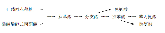 这一族包括苯丙氨酸、酪氨酸和色氨酸,它们的碳架来自于糖酵解的中间产物磷酸烯醇式丙酮酸(PEP)和磷酸戊糖途径中的 4-磷酸赤藓糖。芳香族氨基酸合成关系如下: