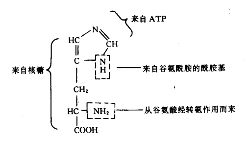 组氨酸的合成过程较复杂,它是由 ATP、磷酸核糖焦磷酸(PRPP)、谷氨酸和谷氨酰胺合成的。组氨酸分子中各原子来源如下: