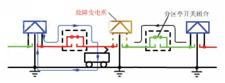 越区供电是当某一牵引变电所因故障不能正常供电时,故障变电所担负的供电臂,经分区亭开关设备与相邻供电臂接通,由相邻牵引变电所进行临时供电。这种供电方式称越区供电。因越区供电增大了该变电所主变压器的负荷,对电器设备安全和供电质量影响较大,因此,只能在较短时间内实行越区供电,是避免中断运输的临时性措施。