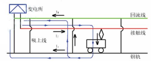 接触网上的牵引电流流经吸流变压器原边绕组,经电力机车流人钢轨。吸流变压器次边绕组串入回流线内,通过吸流变压器电磁工作原理,将钢轨回路中的牵引电流经吸上线吸引至回流线并返回牵引变电所。在理想的情况下,接触网与回流线上的电流大小相等方向相反,它们在周围空间产生的电磁场互相抵消,从而消除了对附近通信线路的电磁干扰。但实际上,回流线的电流总是小于接触网上的电流,仍有少部分牵引电流经钢轨和大地返回牵引变电所。另外,当电力机车位置在吸流变压器附近时,从机车到吸上线之间的半段距离中,牵引电流基本上流经钢轨,这种情况称为“半段效应”,上述情况下对通信线路仍有一定的干扰。因此该种供电方式已经逐步淘汰。