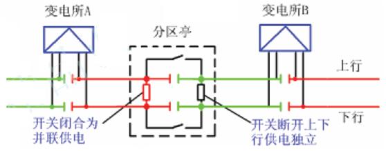 每一供电臂分别向上、下行接触网供电,因此牵引变电所馈出线有四条。同一侧供电臂上、下行线实行并联供电,可提高供电臂末端电压。越区供电时,通过分区亭开关设备来实现。