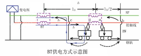 在牵引供电系统中加装吸流变压器一回流线装置的供电方式称BT供电方式,这种供电方式适用于电气化铁道穿越大、中城市及铁路两侧分布通信线路较多的地区,能有效地减轻电磁场对附近通信设备的干扰影响,但由于吸流变压器原、次边线圈串入接触网和回流线内,使牵引网阻抗增大、降低了供电臂末端电压,造成牵引变电所间距减小、馈电回路结构复杂、造价较高等弊病。