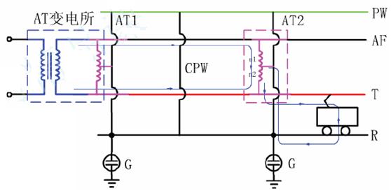 在AT牵引变电所中,牵引变压器将110kV三相电降压至单相55kV,然后经自耦变压器两端分别接到接触网和正馈线上,自耦变压器中心抽头与钢轨相连。则钢轨与接触网间的电压正好是自耦变压器两端电压的一半即27.5kV,与正常接触网工作电压相同。