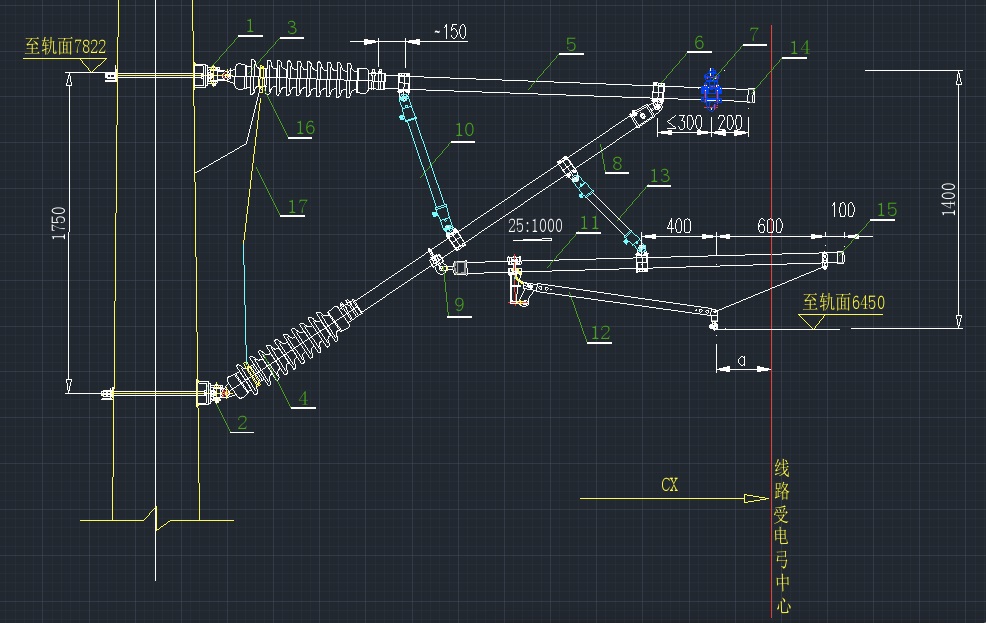 其中接触网安装图与一般机械制图的区别在于,接触网安装图由于设备是标准化生产的,不需要完整的表示设备结构,常常只要两个视图就能表示清楚相关安装、调试顺序即可,尺寸仅仅标注设备中各零件之间的相互位置关系。