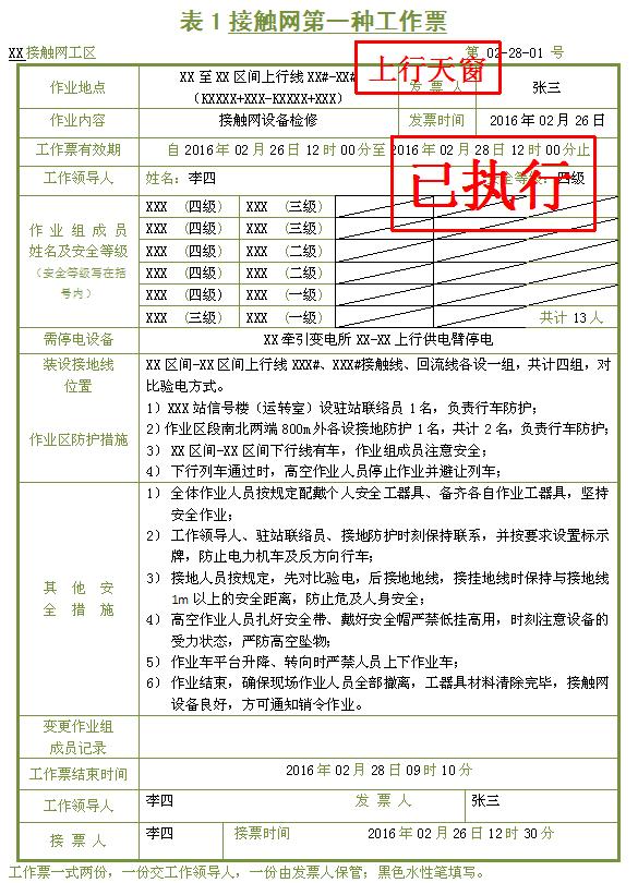接触网第一种工作票,用于停电作业。白纸绿字。具体格式和填写规范见表1。