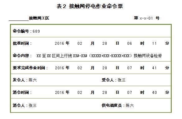 要令:称“×××接触网工区全体作业组成员均已到达施工现场,并准备就绪,请求×××线,×××—×××区间(或×××站场)上行(或下行)×××#—×××#支柱间所有接触网带电设备停电。作业内容:清扫绝缘子等,要令人×××。”消令:称“×××接触网工区×××线,×××—×××区间(或×××站场)上行(或下行)第×××号接触网停电作业命令于××时××分完成,可以恢复送电通车,请求消令,消令人×××。”