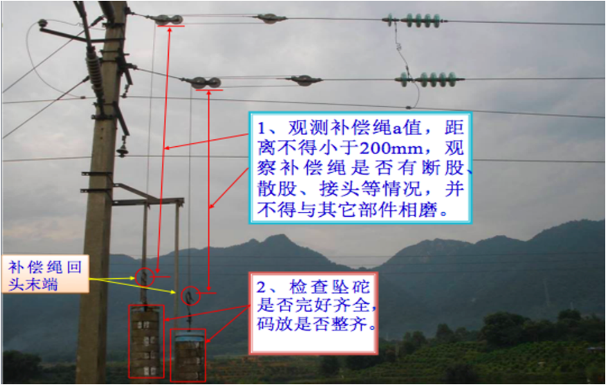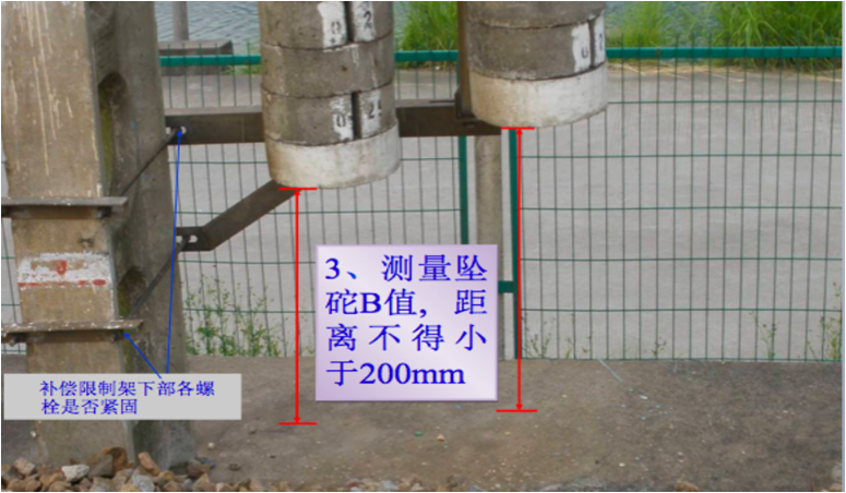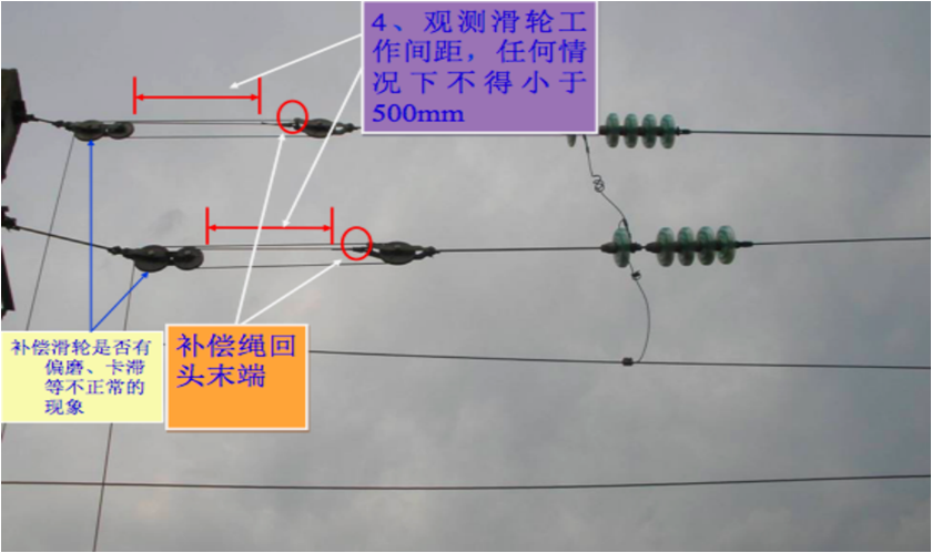 | 10 | 补偿装置 | 检查滑轮间距是否足够,滑轮是否灵活,有无偏磨,补偿绳有无入槽,有无断股、散股,有无磨下锚拉杆,动滑轮与定滑轮之间的距离是否大于500MM,补偿A、B值是否符合规定,坠砣堆码是否整齐,坠砣数量是否足够各零部件安装是否正确,有无锈蚀等。 | |