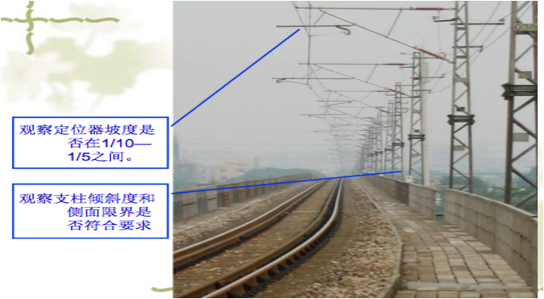 4)曲线区段巡视:观察定位器坡度是否在1/10—1/5之间;观察支柱倾斜度和侧面限界是否符合要求;观察曲线区段的弓网关系。
