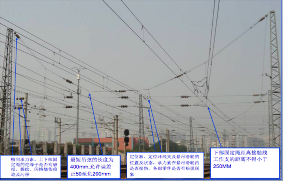 | 19 | 吊弦及斜拉线 | 吊弦偏移应不大于吊弦长度的1/10、吊弦是否断裂、锈蚀,整体吊弦不松弛,无断股、散股,两端线夹处无烧伤痕迹。斜拉线是否锈蚀、折断。 | |