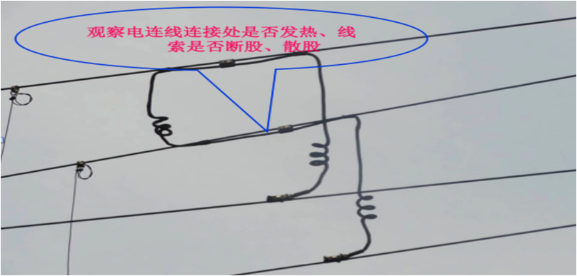 3)电气连接部位巡视:观察电气连线连接处是否放电发热、线索是否断股、散股;绝缘和受力状态情况;线索安装入槽及连接线的裕度是否良好。