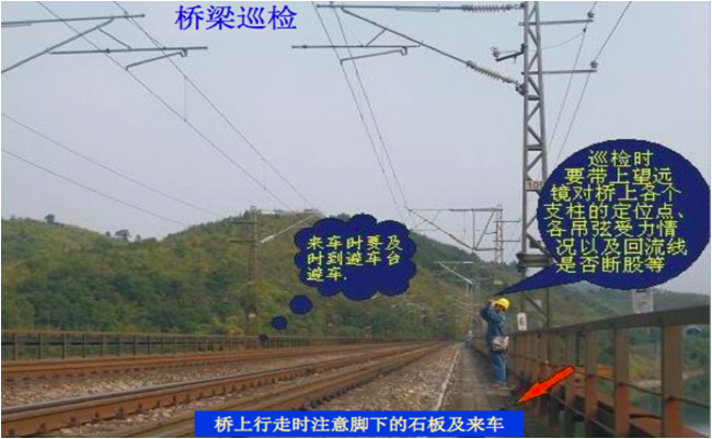 5)桥梁上巡视:用望远镜观察桥梁各支柱的定位点、吊弦受力情况,回流线是否断股等;观察接触网斜钢柱是否锈蚀,基础是否良好;观察桥两端是否有接地线或接地线是否良好。注意来车,来车时提前到避车台避车,桥上行走时注意脚下的石板及空隙。