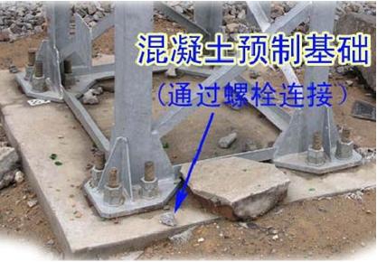 钢柱是立在以钢筋混凝土浇成的基础之上,基础用以稳定钢柱不倾斜及下沉。配合不同支柱类型及土壤性质,有不同基础类型以适应不同悬挂受力要求。钢柱通过埋入在基础当中的螺栓与基础连接,然后再用混凝土封住支柱与基础连接部分(称为基础帽),可以保证地脚螺栓不受锈蚀或受碰撞弯曲。