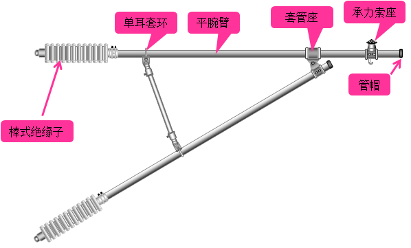 (1)平腕臂用于组成旋转腕臂结构三角形的上部,平腕臂悬臂一端通过铝合金承力索座支撑承力索,另一端与棒式绝缘子(材质:瓷质、硅胶复合材料)相连,通过铝合金套管座与斜腕臂连接。
