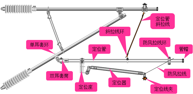 1)定位管连接于腕臂结构上,其中一端连接双耳套筒通过定位环(单耳套环)与斜腕臂连接,另一端用定位管斜拉线与承力索座相连接。