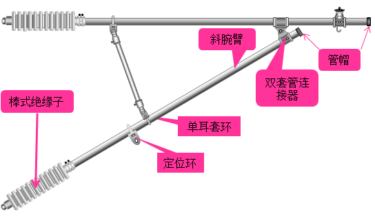 (2)斜腕臂用于组成腕臂支持结构三角形斜边,斜腕臂一端通过铝合金套管座与平腕臂相连接,另一端通过棒式绝缘子与下腕臂底座相连接。