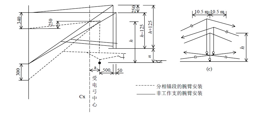 分相锚段与既有接触网的2 个下锚支组成2个绝缘锚段关节并重合2个锚段关节的1 跨或2 跨,在分相无电区工作范围内利用分相锚段作工作支,而分相锚段与既有锚段间采用相间空气绝缘的装配形式,从而达到分相的目的。