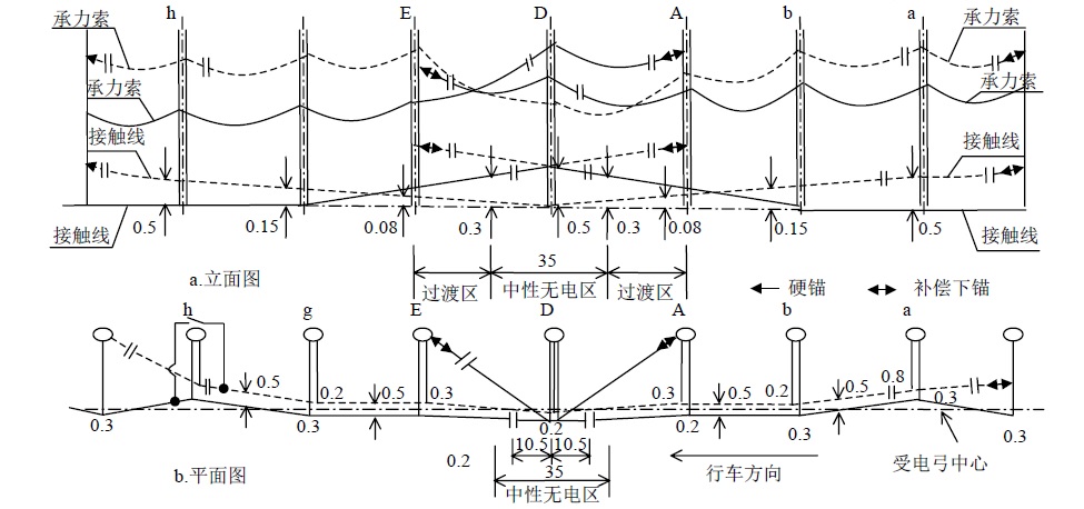 (4)在转换柱 g,E 间和A,b 间,分相锚段接触线与正线(Ⅰ、Ⅱ)的接触线等高且比正线标准导高抬高约80 mm。
