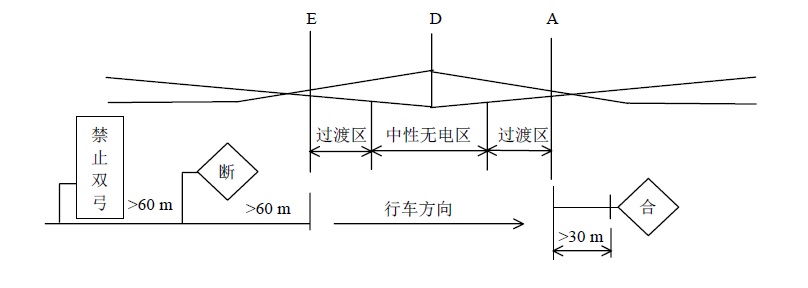 (2)电力机车通过中性区段时为断电惰行通过,保证列车安全通过而不发生短接事故,中性区段不宜过长,其长度以电力机车升起双弓时不短接不同相接触线为限。