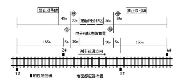 (1)地面感应装置,称地感器,它安装在电分相区域中的相应位置,能准确为电力机车进行分相断电过电分相提供准确的位置信息。其地面感应装置布置如图所示。